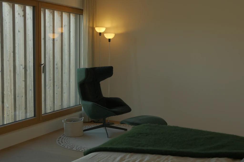 Eine warme, indirekte Grundbeleuchtung sorgt für ein angenehmes Raumgefühl und vermeidet grelle Lichtquellen. Nachttischlampen oder Wandleuchten mit sanftem Licht bieten optimalen Komfort zum Lesen, ohne die entspannte Stimmung zu stören. Dimmbare Leuchten ermöglichen eine flexible Anpassung der Helligkeit – von gemütlichem Ambiente bis hin zu funktionaler Ausleuchtung beim Ankleiden.