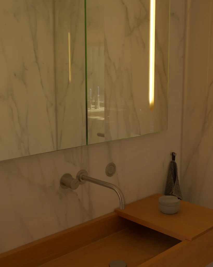 Durch eine Kombination aus funktionaler und stimmungsvoller Beleuchtung entsteht ein harmonisches Ambiente, das den perfekten Start in den Tag ermöglicht – und ihn mit einem entspannten Ausklang abrundet.